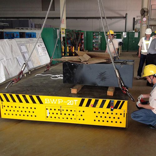 客戶需要在1號車間和2號車間廠房進(jìn)行往返運(yùn)行,在1號車間用重型吊車吊起模具然后放置在無軌模具車上,然后通過無軌模具車在運(yùn)輸?shù)?號車間,進(jìn)行下面的流程,運(yùn)輸距離大致在50米左右,我們?yōu)榭蛻袅可矶ㄖ颇>咿D(zhuǎn)運(yùn)車是我公司一款BWP20t 產(chǎn)品,該模具平板車具有操作靈活,360度無死角防護(hù)、遇人自動停止等功能,既保證了車間人員的安全,又輕盈便捷將繁重的模具搬運(yùn)至目的地.