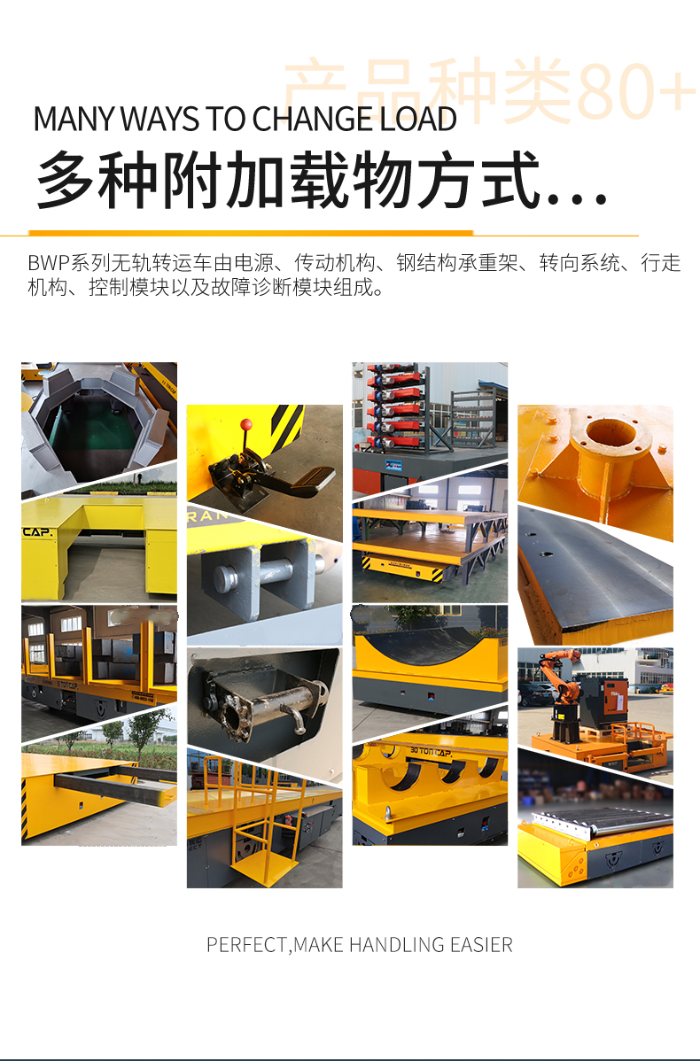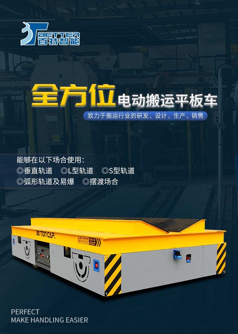 BZH型無軌搬運車是一種以蓄電池或電纜為動力源的車間內(nèi)運輸車輛。又稱臺車、過跨車、地爬車。該車具有結(jié)構(gòu)緊湊、操作方便、可橫縱移動、調(diào)速性能好及污染低、運輸效率高等特點。該車型外形尺寸小,也可進(jìn)入空間小的倉庫、彎道完成物料運輸,可減輕工人的勞動強度,提高生產(chǎn)效率。作為短距離運輸工具得到廣泛應(yīng)用,也可作為車間內(nèi)部配合吊車運輸重物過跨之用。 該車型采用是一種以蓄電池或電纜為動力源,電壓可有24V、36V、48V、72V、110V。一般蓄電池安裝在平車內(nèi)部,電源通過電氣控制系統(tǒng),給電機提供電力,使平車實現(xiàn)啟動、