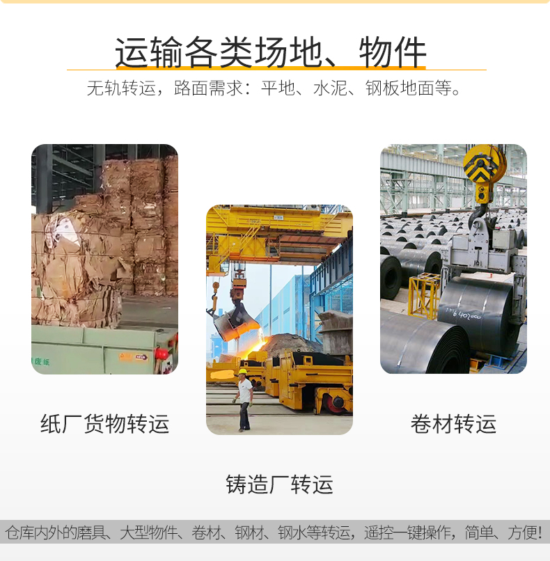 BZH型無軌搬運車是一種以蓄電池或電纜為動力源的車間內(nèi)運輸車輛。又稱臺車、過跨車、地爬車。該車具有結(jié)構(gòu)緊湊、操作方便、可橫縱移動、調(diào)速性能好及污染低、運輸效率高等特點。該車型外形尺寸小,也可進(jìn)入空間小的倉庫、彎道完成物料運輸,可減輕工人的勞動強度,提高生產(chǎn)效率。作為短距離運輸工具得到廣泛應(yīng)用,也可作為車間內(nèi)部配合吊車運輸重物過跨之用。 該車型采用是一種以蓄電池或電纜為動力源,電壓可有24V、36V、48V、72V、110V。一般蓄電池安裝在平車內(nèi)部,電源通過電氣控制系統(tǒng),給電機提供電力,使平車實現(xiàn)啟動、